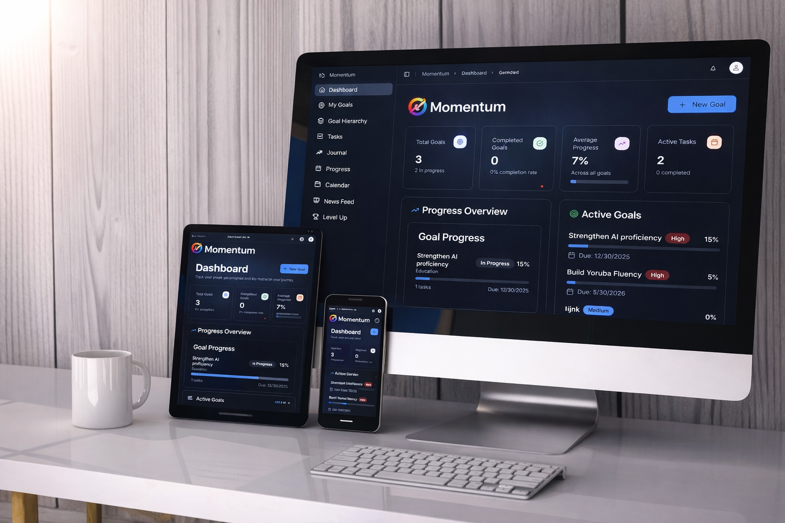 Momentum is a personal goal management app that helps people turn evolving personal and professional aspirations into consistent progress through structured planning, reflective journaling, smart reminders, and motivating feedback loops.