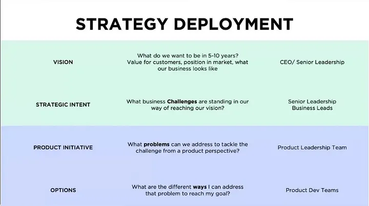 This likely should have been determined prior to the product team ever being assembled, as the concept of strategic product management, urges organizations to establish a clear product strategy that aligns with business objectives. This involves setting measurable goals, defining key performance indicators, and regularly assessing progress. In other words, strategy should be leveraged as a “connector” of sorts. Strategy should connect vision to economic outcomes. It should connect products to initiatives, so on and so forth (Read my piece on product visionining). Perri asserts good strategic product management is “not a plan but a framework that helps to make decisions!”. Strategy is created and deployed at each level and across the company.